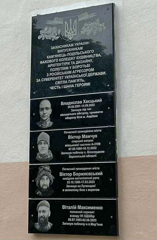 17 червня на фасаді Кам’янець-Подільського фахового коледжу будівництва, архітектури та дизайну відкрили меморіальні дошки чотирьом Захисникам – солдату Владиславу ХАЄЦЬКОМУ, старшому матросу Віктору МАМЧУКУ, солдату Віктору БОРЖИЄВСЬКОМУ та головному сержанту Віталію МАКСИМЕНКУ, які тут навчалися.