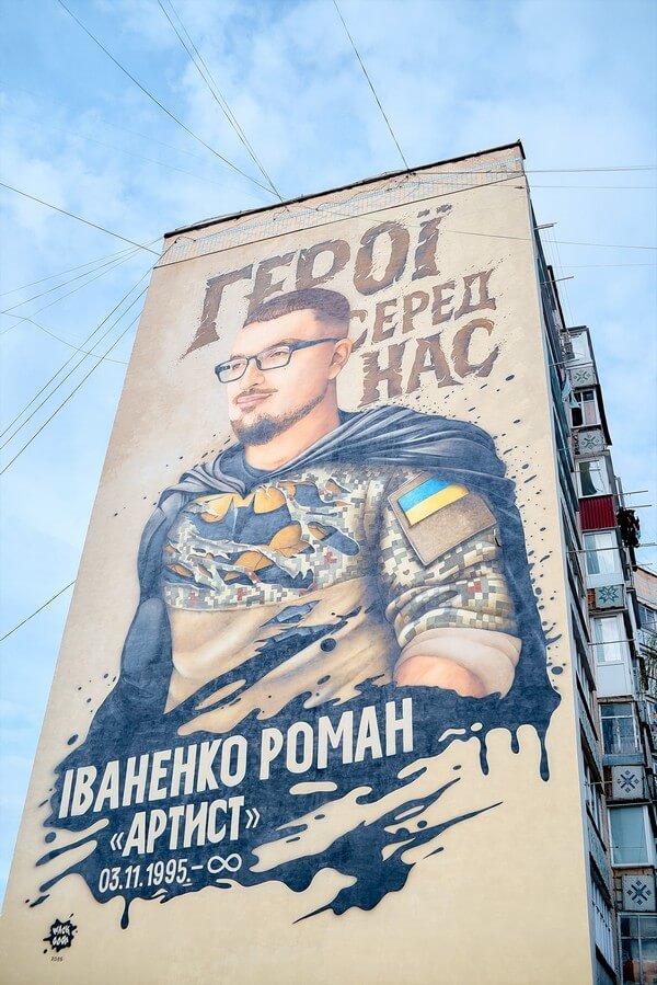 Автором муралу на фасаді багатоповерхівки на Хмельницькому шосе став художник Віталій ФІСУН, який створює серію стінописів, присвячених воїнам, що загинули в боротьбі з російським агресором. У листопаді минулого року художник завершив ще один масштабний проєкт – мурал, присвячений пам’яті трьох полеглих Героїв російсько-української війни в мікрорайоні Жовтневому: Андрія БАНДОЛИ, Віктора ГОРЧИНСЬКОГО, Андрія ТВЕРДОХЛІБА.