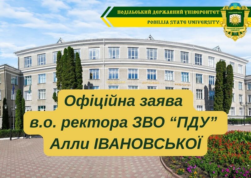 Уранці цього ж дня на сайті ПДУ оприлюднено Офіційну заяву в.о. ректора Закладу вищої освіти «Подільський державний університет» Алли ІВАНОВСЬКОЇ: